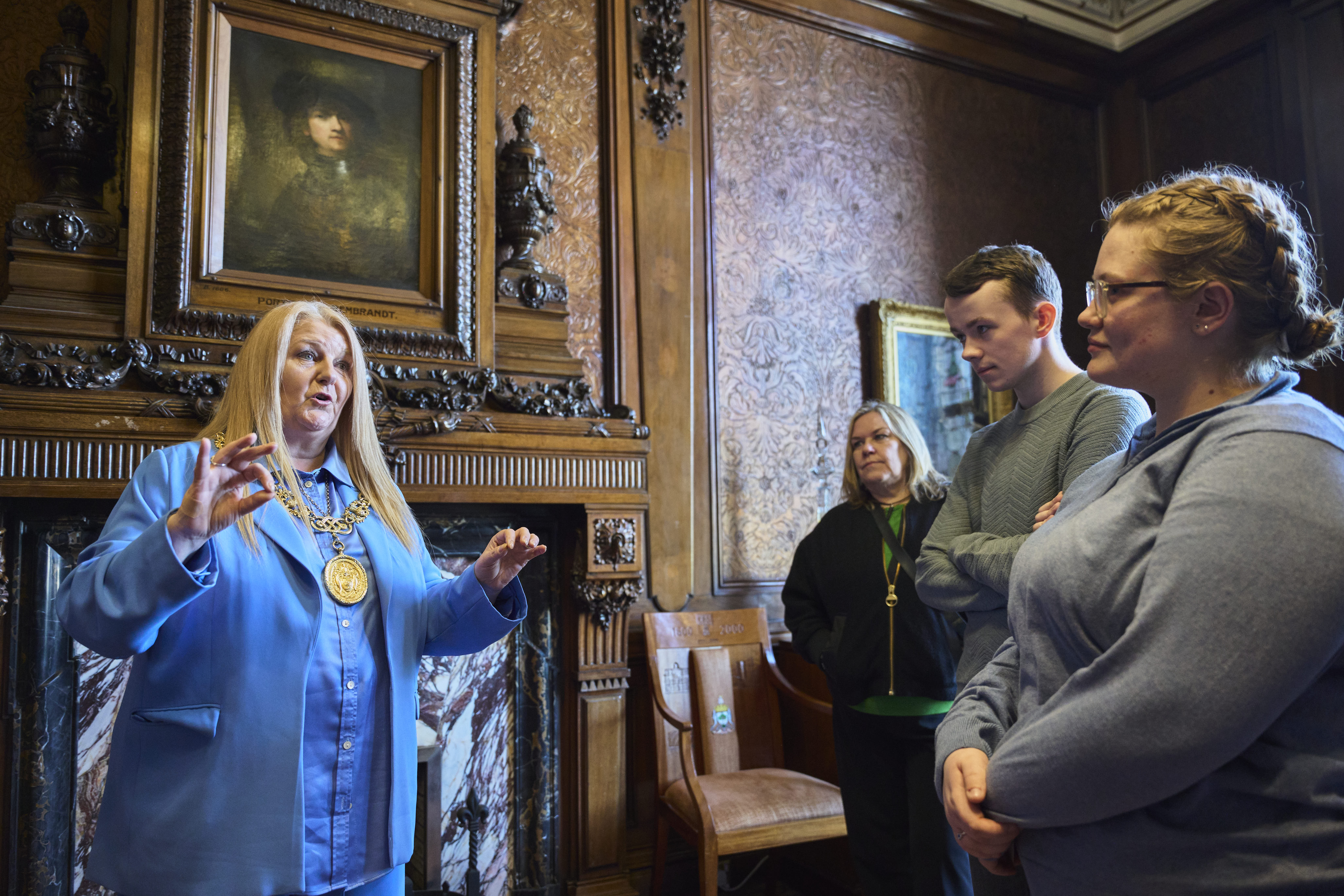 Jacqueline McLaren, Lord Provost of Glasgow, speak with students at Glasgow City Chambers.